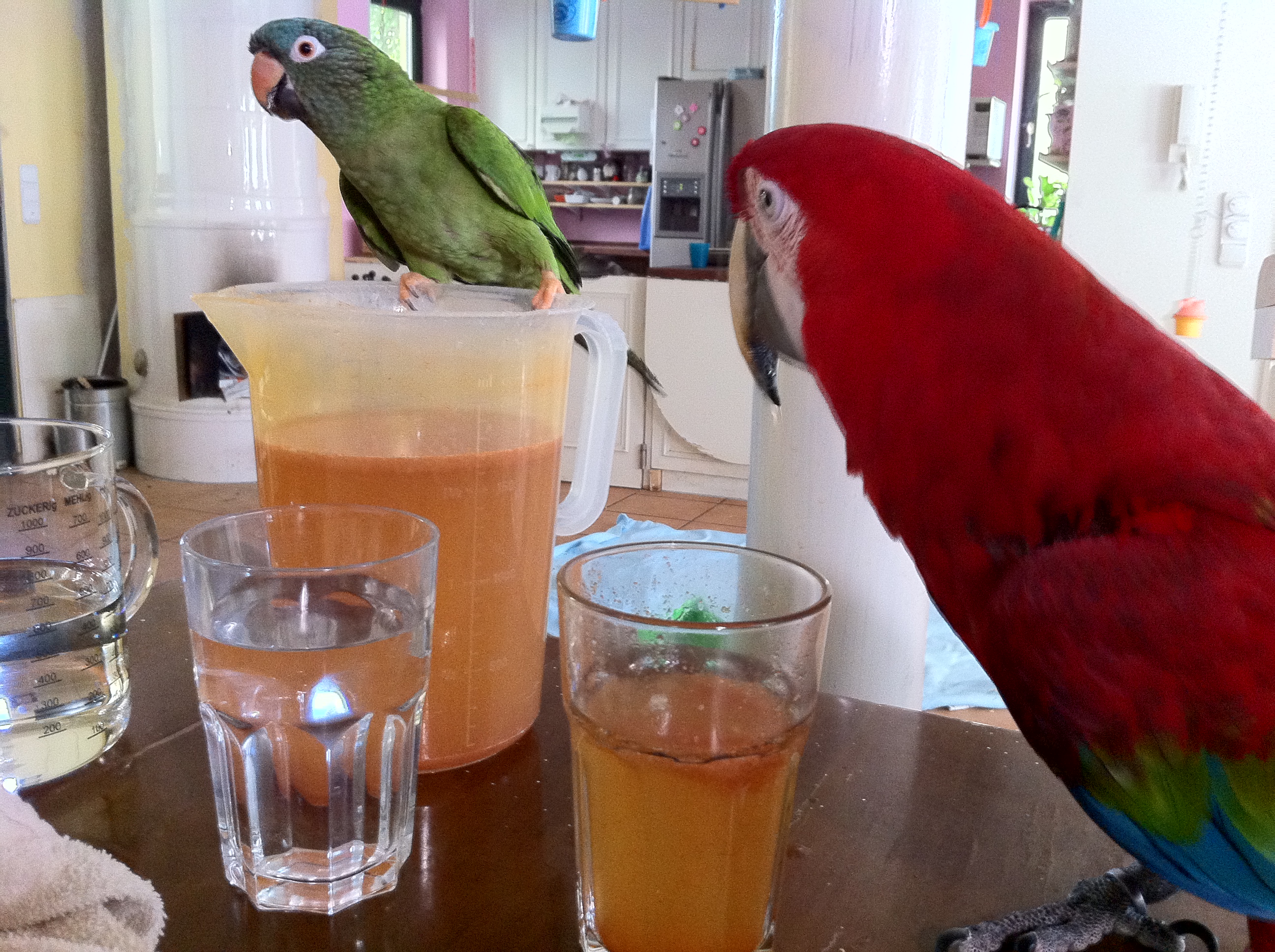 Greenwing macaw and Blue Crowned Conure Drink Lemonade